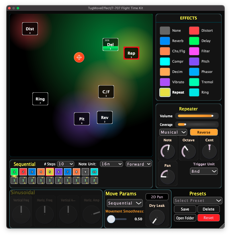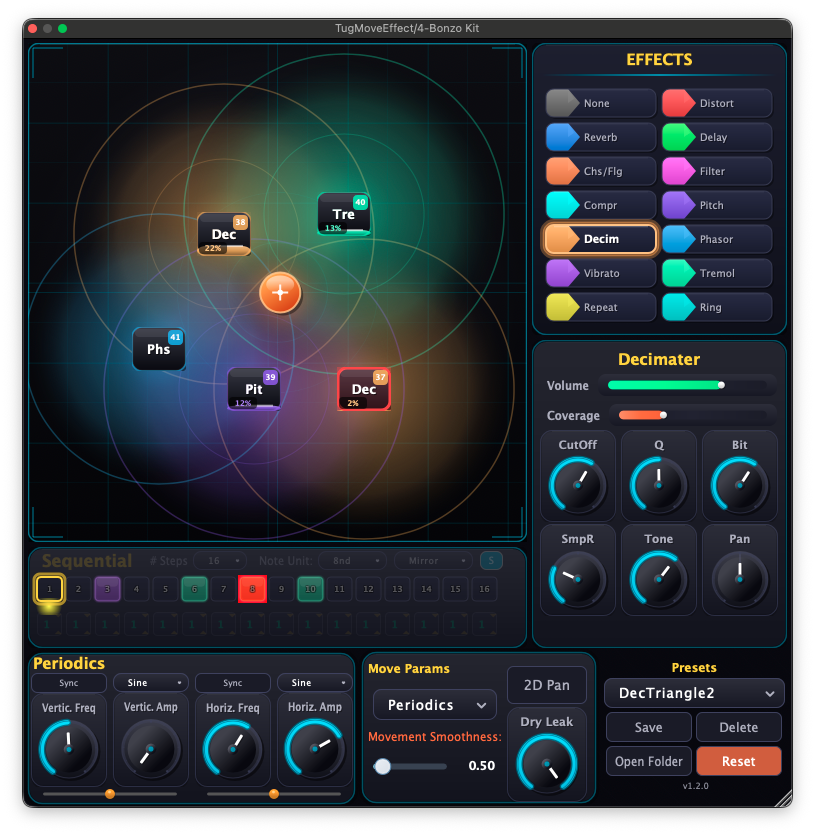 Place mulltiple effects instances on a 2D workspe and control their influence through distance-based mixing. A movable control point determines how much each effect contributes to the final sound based on its proximity.