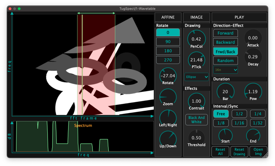 TugSpect : an experimental fx vst3 plugin that takes sound manipulation by allowing to scan an image and dynamically shape the incoming audio of a track using the pixel values : any image, from abstract art to your own photographs , and use it as a template for sound transformation. You can draw basic shapes like elipses rectangles and lines. It employs real-time Fast Fourier Transform (FFT) filtering to analyze the incoming audio and apply spectral processing that mirrors the pixel values in the image.